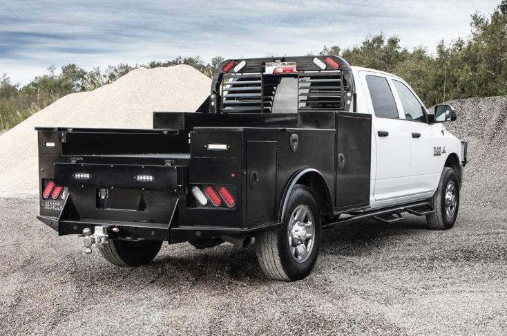 Our skirted flatbed that offers tall, integrated front toolboxes
