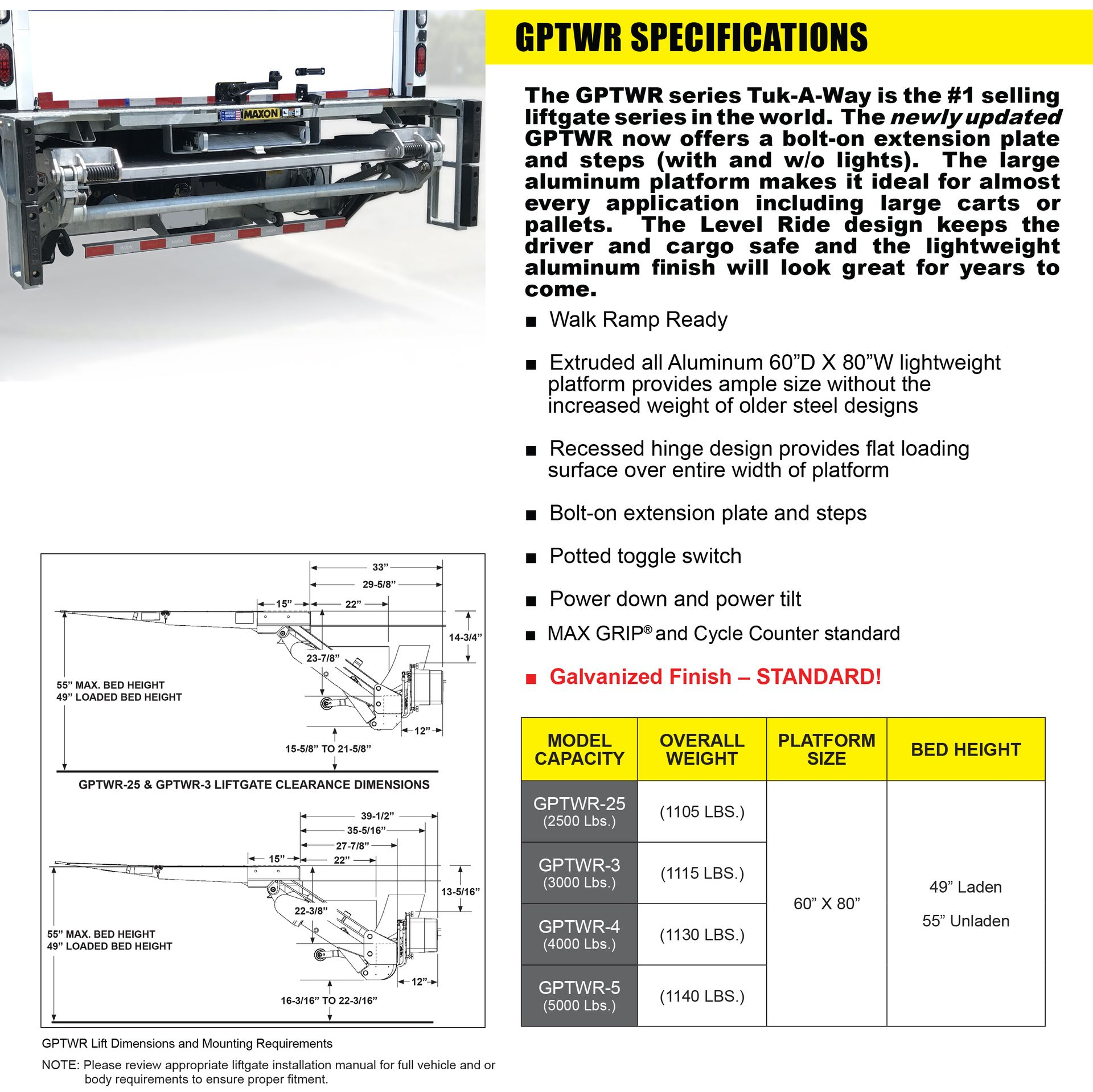 Maxon GPTWR Liftgate Specifications