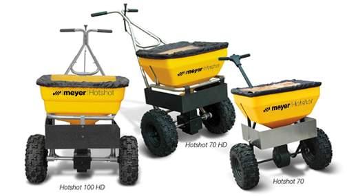 Meyer’s premium Hot Shot broadcast spreaders were built to handle extreme conditions year-round and can hold 70 or 100 pounds of material with a maximum spread range of 12 feet to 18 feet, depending on the model. Heavy-duty models are made of stainless steel.