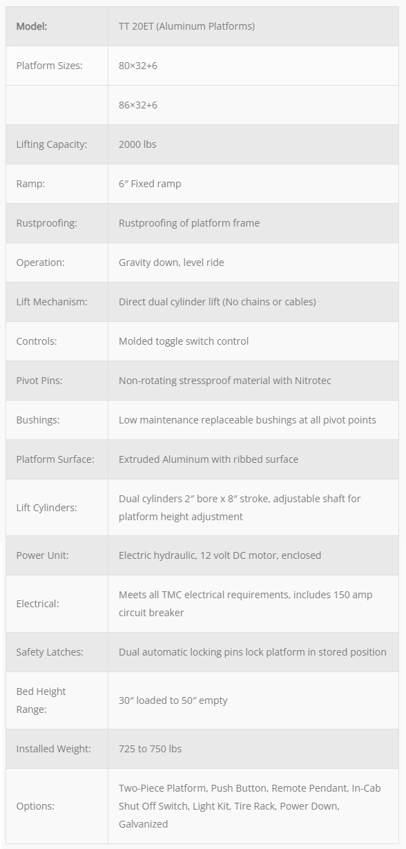 Thieman TT 20ET Aluminum Liftgate Specifications