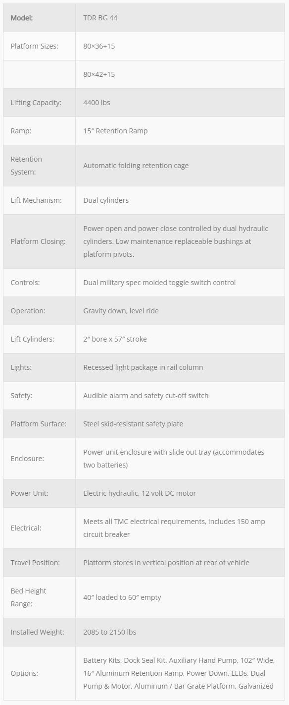 Thieman TDRBG 44 Liftgate Specifications